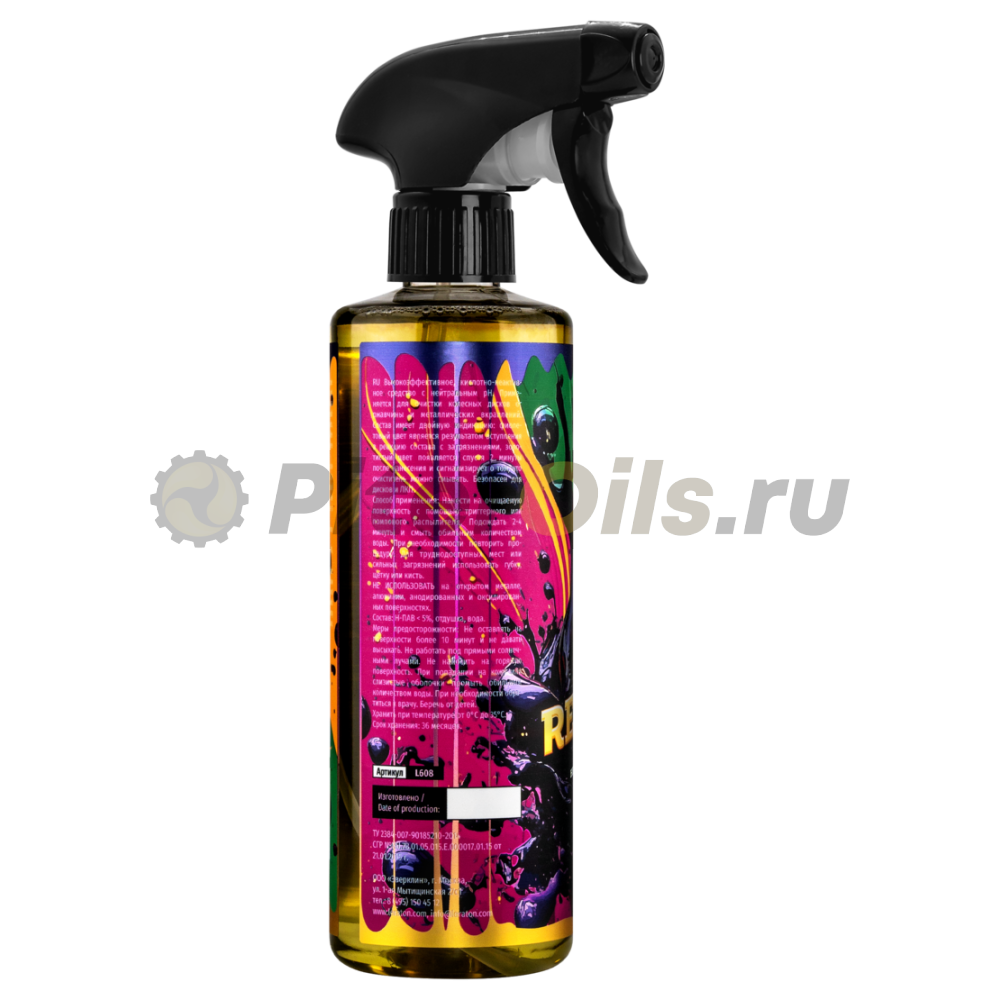Высокоэффективное, кислотно-неактивное средство с нейтральным рН. Применяется для очистки колесных дисков от ржавчины и металлических вкраплений. Состав имеет двойную индикацию: фиолетовый цвет является результатом вступления в реакцию состава с загрязнениями, золотистый цвет появляется спустя 2 минуты после нанесения и сигнализирует о том, что очиститель можно смывать. Безопасен для дисков и ЛКП.