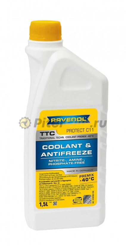 Антифриз RAVENOL TTC Protect C11 Premix -40C - наиболее популярный, готовый к применению антифриз желто-зеленого цвета, соответствующий допуску G11.
