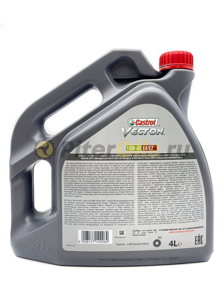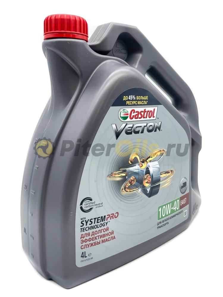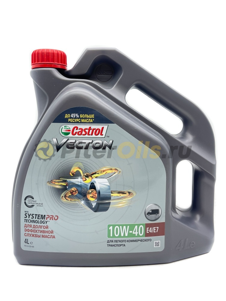 Castrol VECTON 10W-40 E4/E7 - моторное масло с синтетическими компонентами для дизельных двигателей коммерческого транспорта, созданное с использованием передовых технологий производства смазочных материалов, специально разработанное для обеспечения более длительного срока службы масла. Castrol VECTON® 10W-40 E4/E7 предназначено для использования в мощных дизельных двигателях, соответствующих требованиям от Euro I до Euro V. Также подходит для двигателей, не оснащенных сажевыми фильтрами, некоторых видов двигателей с системой EGR и двигателей, оснащенных системой избирательной каталитической нейтрализации (SCR NOx).