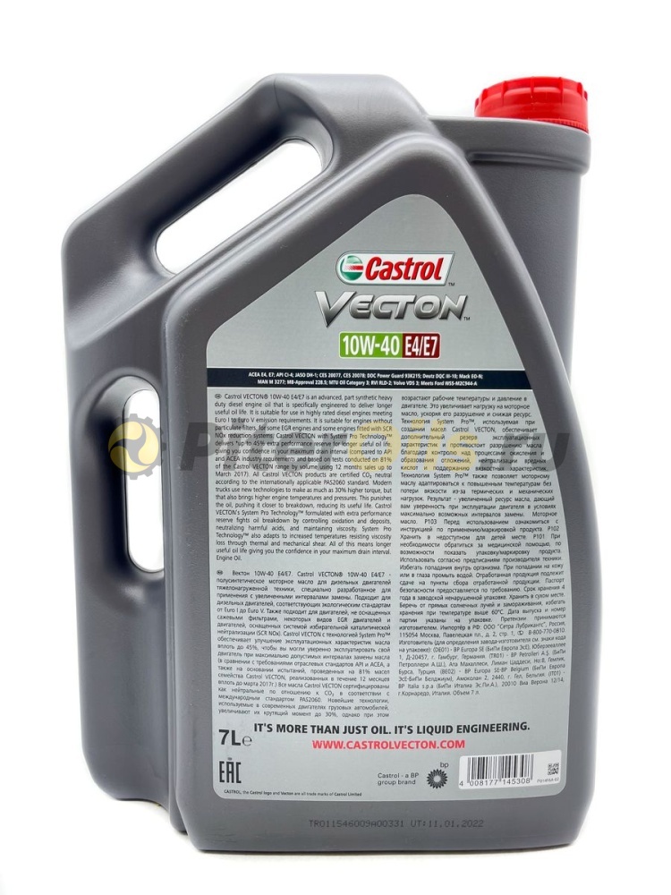 Castrol VECTON 10W-40 E4/E7 - моторное масло с синтетическими компонентами для дизельных двигателей коммерческого транспорта, созданное с использованием передовых технологий производства смазочных материалов, специально разработанное для обеспечения более длительного срока службы масла. Castrol VECTON® 10W-40 E4/E7 предназначено для использования в мощных дизельных двигателях, соответствующих требованиям от Euro I до Euro V. Также подходит для двигателей, не оснащенных сажевыми фильтрами, некоторых видов двигателей с системой EGR и двигателей, оснащенных системой избирательной каталитической нейтрализации (SCR NOx).