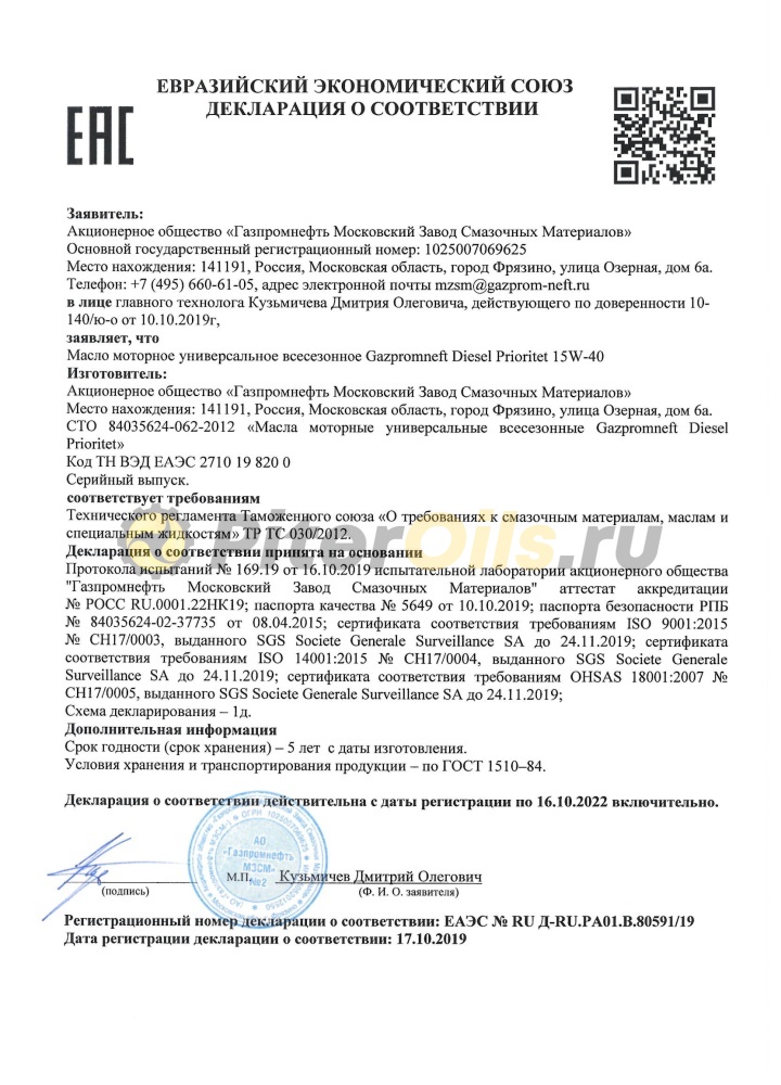 ПРЕИМУЩЕСТВА Газпром-Нефть Дизель Приоритет 10w40