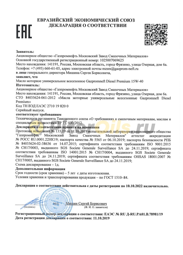 • Допуски API CI-4/SL;ACEA E7;Cummins CES 20078 Deutz DQC III;Volvo VDS-3;Renault Trucks RLD-2;MTU Cat.2;MAN M 3275-1;Mack EO-N;Caterpillar ECF-2;MB-Approval 228.3;Detroit Diesel DDC 93K215;ПАО «КАМАЗ»;ПАО «Автодизель» (ЯМЗ);ПАО "ТМЗ.