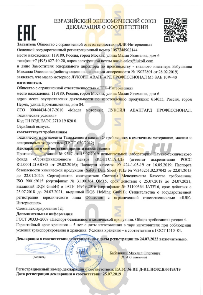 ЛУКОЙЛ АВАНГАРД ПРОФЕССИОНАЛ M5 SAE 10W-40 прошло испытания и одобрено по стандартам: MAN M 3277, MB 228.5, Cummins CES 20078 и Deutz DQC III-10. Масло разработано для современных дизельных двигателей, удовлетворяющих требованиям как Euro-4, так и Euro-5.