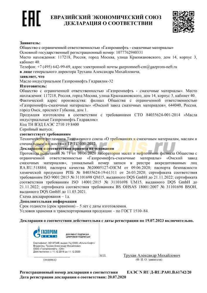 Характеристики гидравлического масла Газпром Гидравлик 32: