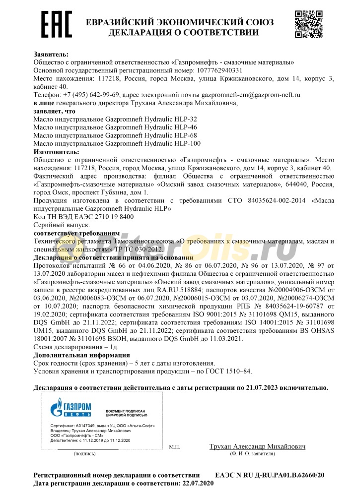 ГАЗПРОМ-НЕФТЬ Гидравлик HLP-32 - серия гидравлических масел, обеспечивающих высокие эксплуатационные характеристики, отвечающих или превосходящих требования основных производителей гидравлического оборудования и других промышленных спецификаций. Производятся на основе минеральных масел глубокой селективной очистки с использованием высококачественного многофункционального пакета присадок.