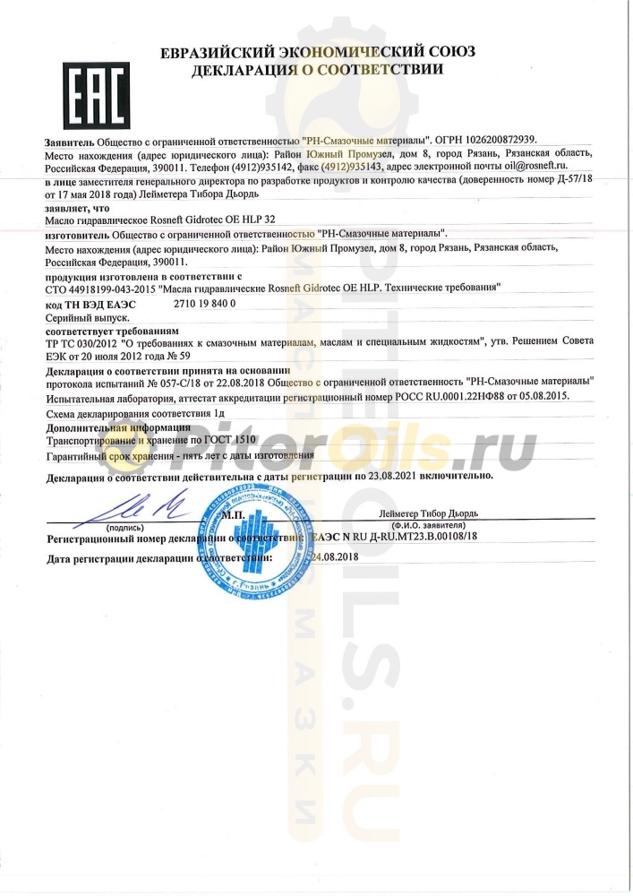 ОСОБЕННОСТИ гидравлического масла Роснефть Гидротек ОЕ HLP 32 :