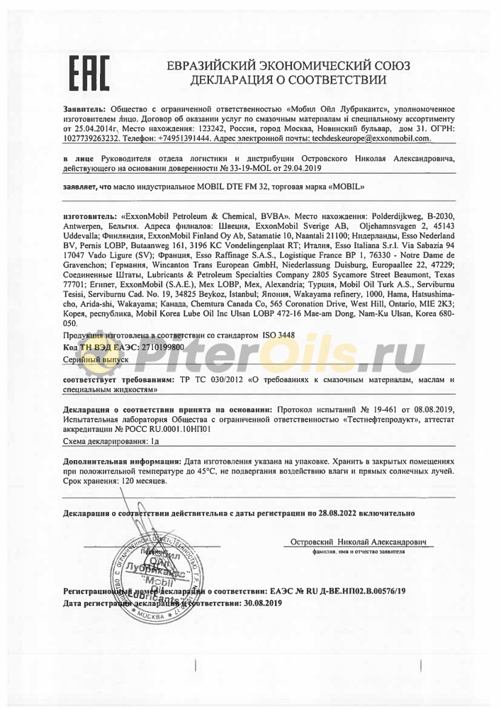 Масло Mobil DTE FM 32 предназначено для разнообразного многофункционального оборудования, применяемого в пищевой промышленности и в производстве упаковочных материалов. Масло соответствует требованиям USDA H 1 и нормативного документа Title 21 CFR 178.3570 Министерства пищевой и фармацевтической промышленности (FDA) США, предъявляемым к смазочным материалам с возможностью случайного контакта с пищевыми продуктами. Масло Mobil DTE FM 32 не имеет вкуса и запаха. Это продукт премиального качества, созданный на основе присадок и базовых масел, классифицирующихся как нетоксичные продукты, допускаемые FDA и USDA к применению для смазывания оборудования пищевой промышленности. Системы присадок обеспечивают хорошую защиту от износа, превосходную стойкость к окислению и защиту от ржавления. Они обеспечивают хорошую степень чистоты системы, продолжительный срок службы масла/фильтров и оптимальную защиту оборудования. Масло Mobil DTE FM 32 подходит для зубчатых передач, подшипников и циркуляционных сист
