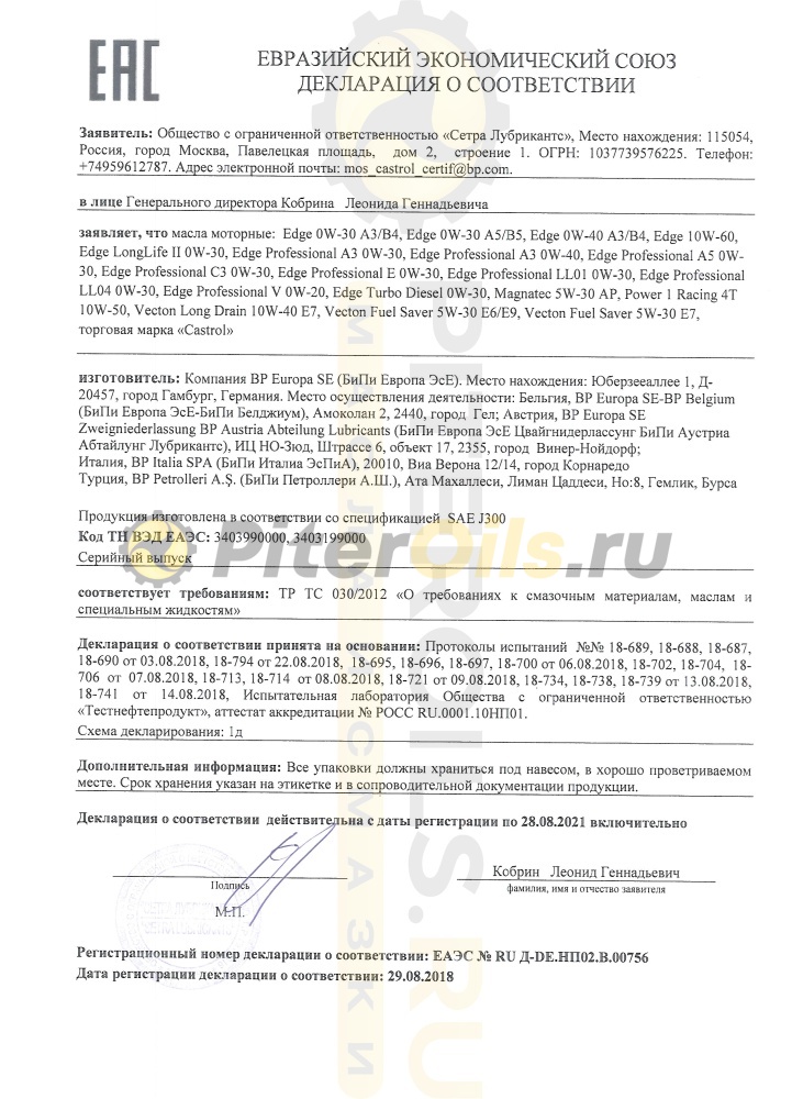 • Спецификации ACEA C3, API SN, Renault RN0700/0710, GM dexos2