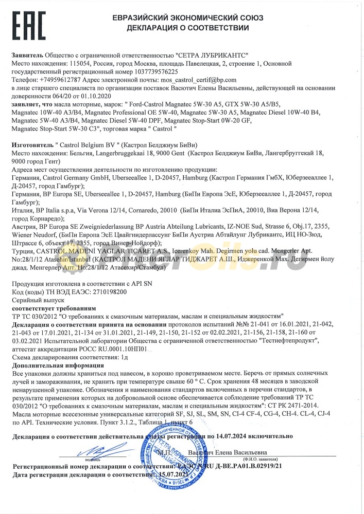 Castrol Magnatec 5W-40 A3/B4 одобрено к применению большинством автопроизводителей.