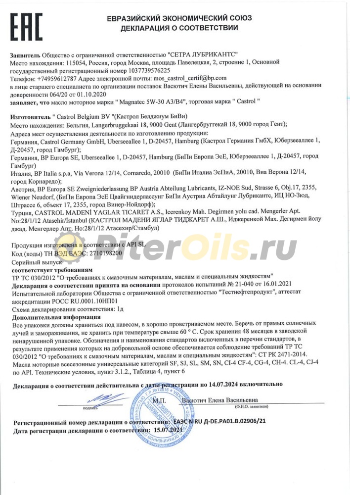 • Спецификации ACEA A3; B3; A3; B4 API: SL; CF