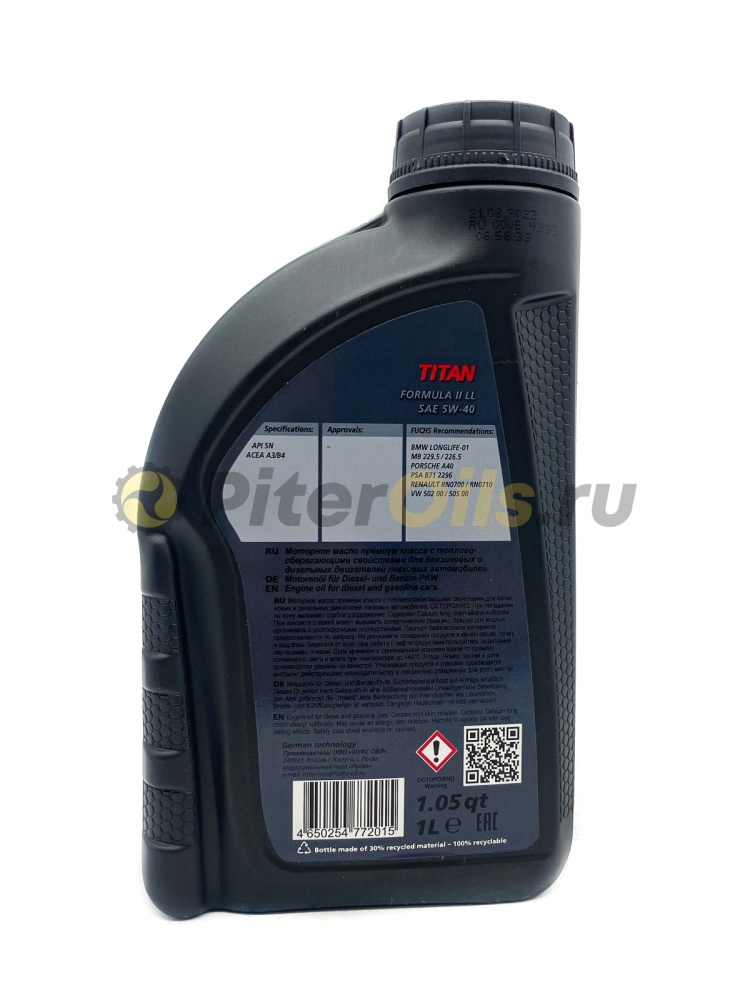 TITAN FORMULA II LL 5W-40 – это премиальное моторное масло, которое обеспечивает высокую производительности при любых условиях окружающей среды.  Специально подобранный пакет присадок способствует сохранению чистоты, поддержанию противокоррозионной и противоизносной защиты, а также достижению надежной смазки деталей двигателя.