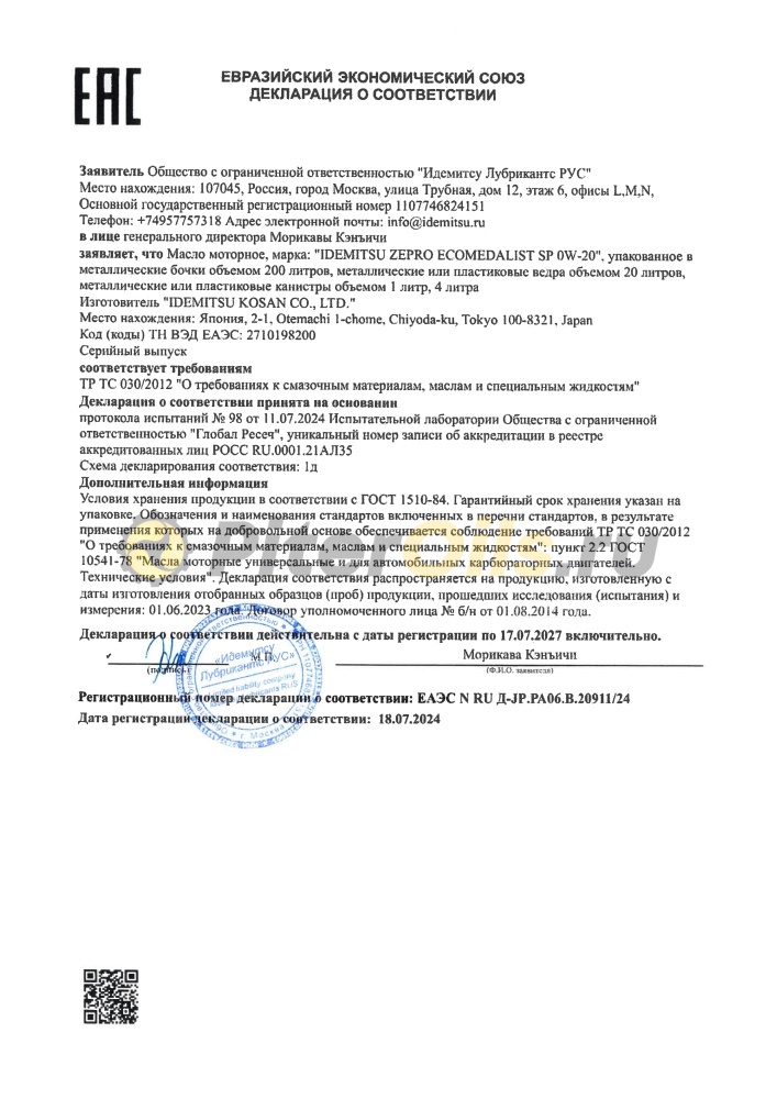 Моторное масло содержит в себе уникальный пакет присадок IDEMITSU Zepro