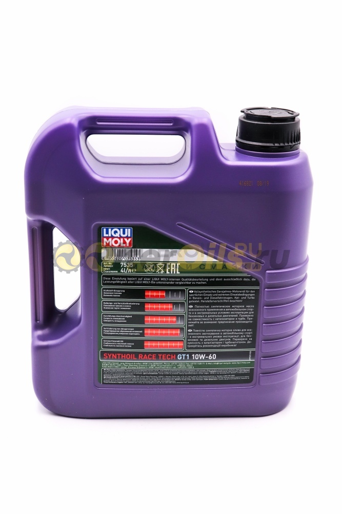 LIQUI MOLY Syntoil Race Tech GT1 10w60 (4л) 7535   100% синтетическое моторное масло на базе полиальфаолефинов (ПАО) для спортивных автомобилей со специально подготовленными моторами. Свойства ПАО-синтетики и высокая вязкость позволяют обеспечить необходимую смазку и защиту деталей двигателя в условиях экстремальных нагрузок на двигатель, характерных для спорта.