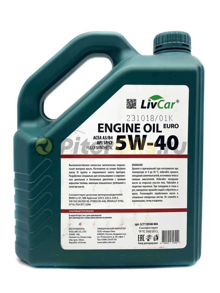 LIVCAR ENGINE OIL EURO 5W40 ACEA A3/B4 API SP (4л) LC7110540004