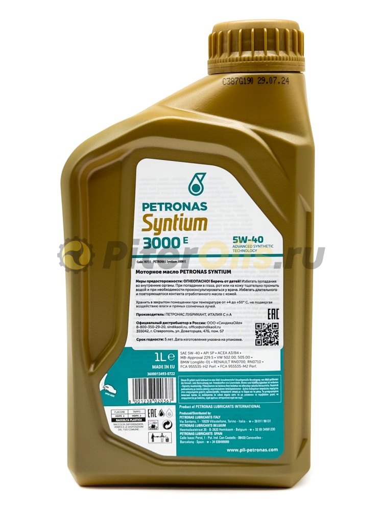 Моторное масло PETRONAS Syntium 3000 E 5W-40 специально предназначено для легковых автомобилей, внедорожников и грузопассажирских автомобилей, в которых используются бензиновые двигатели с турбонаддувом и прямым впрыском, а также дизельные двигатели, такие как у Mercedes-Benz, Volkswagen и Renault (см. руководство пользователя). Оно также подходит для автомобилей, которые оснащены топливными форсунками, мультиклапанами или турбокомпрессорами для тяжелых условий эксплуатации.