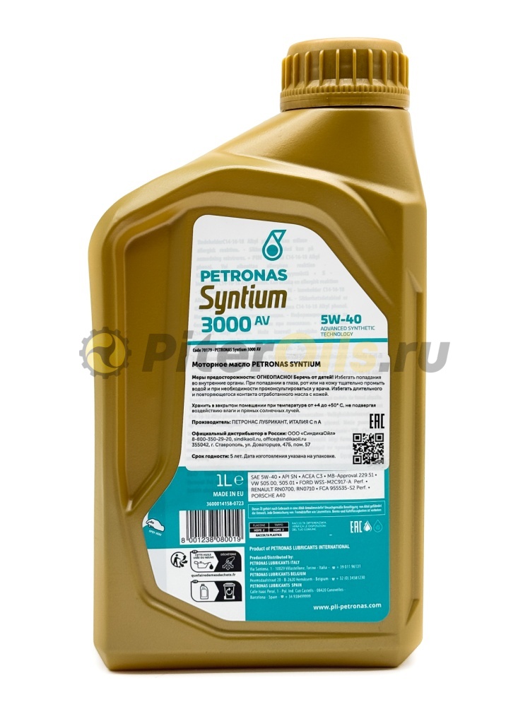 Моторное масло PETRONAS Syntium 3000 AV 5W-40 – это полностью синтетический смазочный материал, разработанный с применением технологии °CoolTech™, которая способствует эффективному регулированию тепловыделения, устойчивости к окислению и предотвращению разложения масла с образованием осадка, чтобы защитить узлы и сохранить КПД двигателя в течение всего срока замены масла.