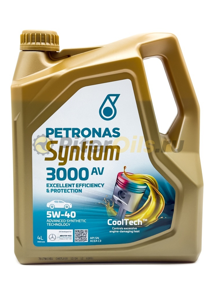 Моторное масло PETRONAS Syntium 3000 AV 5W-40 – это полностью синтетический смазочный материал, разработанный с применением технологии °CoolTech™, которая способствует эффективному регулированию тепловыделения, устойчивости к окислению и предотвращению разложения масла с образованием осадка, чтобы защитить узлы и сохранить КПД двигателя в течение всего срока замены масла.