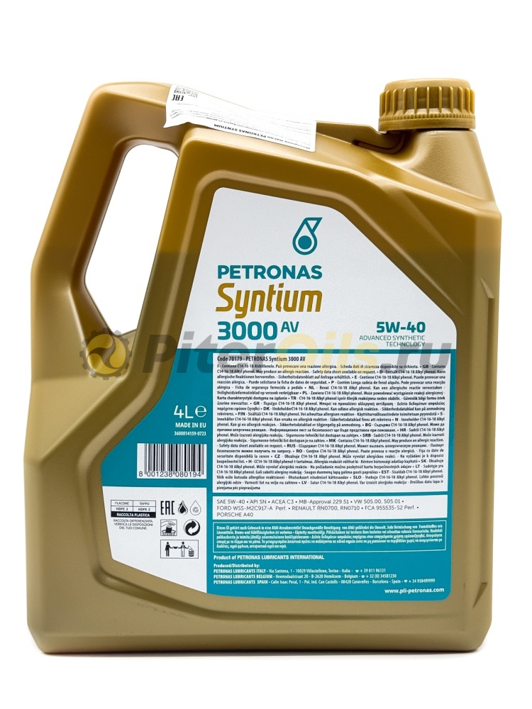 Моторное масло PETRONAS Syntium 3000 AV 5W-40 специально предназначено для легковых автомобилей, внедорожников и грузопассажирских автомобилей, в которых используются бензиновые двигатели с турбонаддувом и прямым впрыском, а также дизельные двигатели, такие как у Volkswagen, Mercedes-Benz (см. руководство пользователя). Оно также подходит для автомобилей, работающих на биотопливе, и автомобилей, которые оснащены системой доочистки выхлопных газов и устройствами контроля выбросов, такими как каталитические нейтрализаторы, топливные форсунки, мультиклапаны или турбокомпрессоры для тяжелых условий эксплуатации.