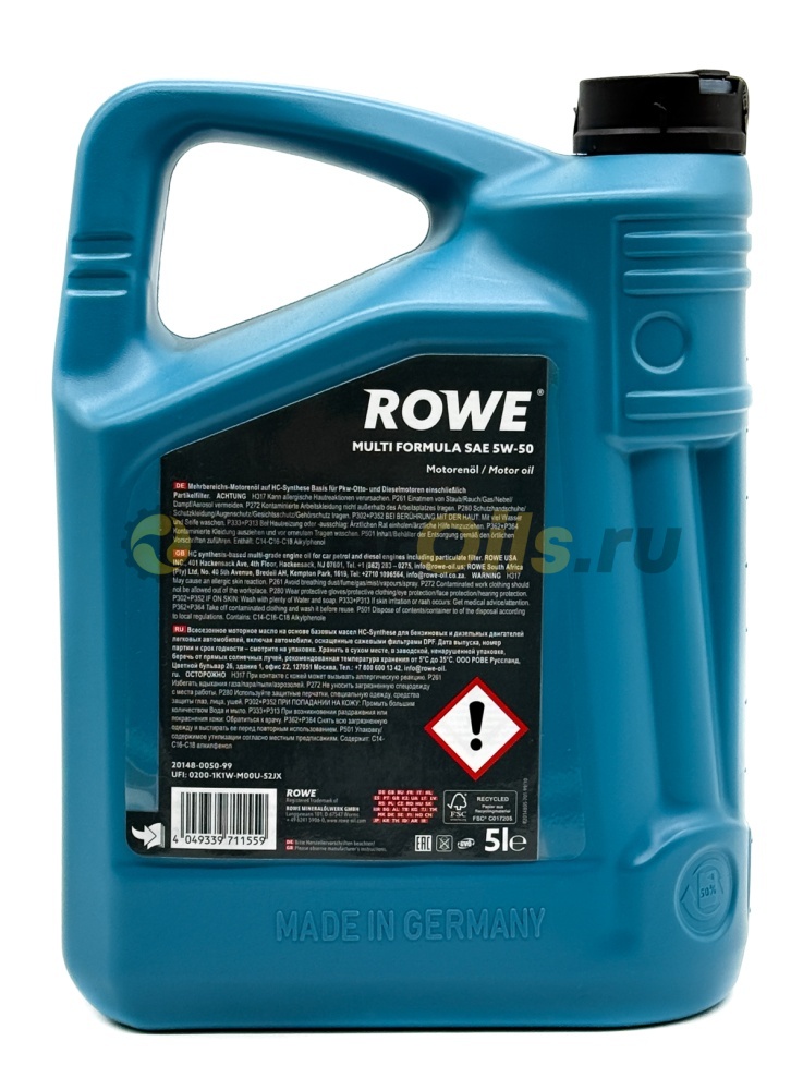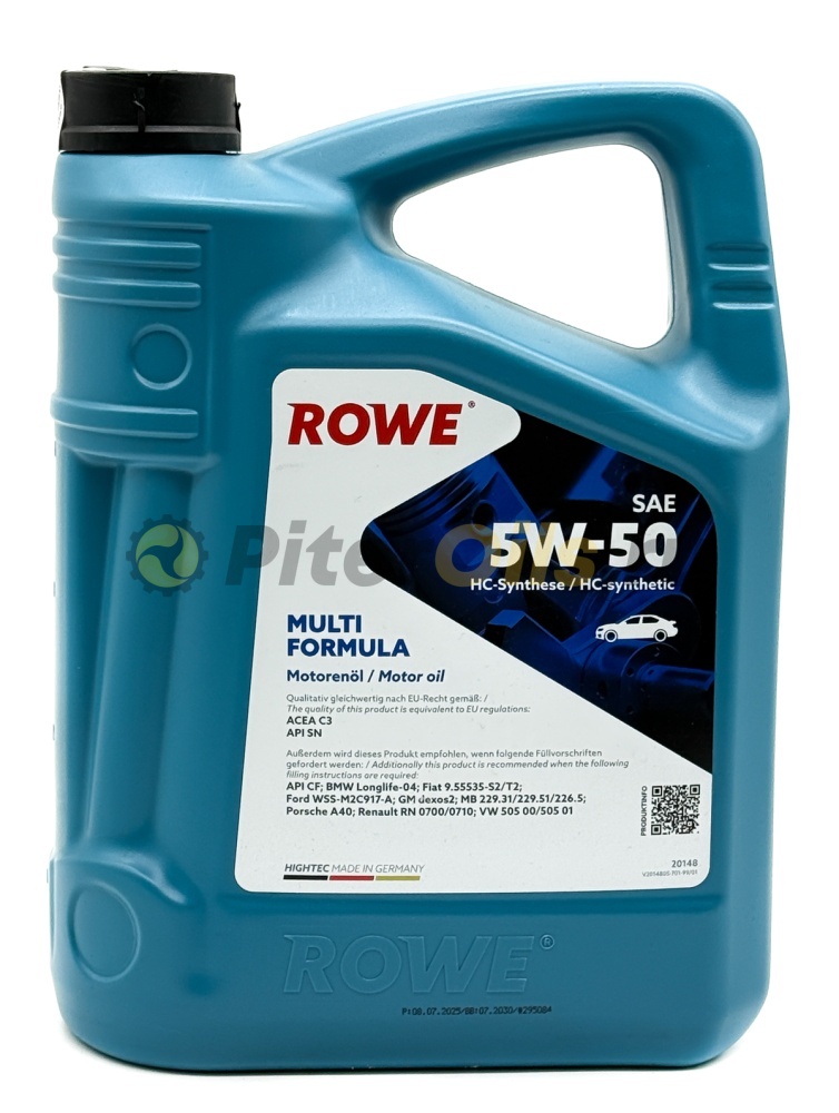 ROWE Моторное масло HIGHTEC MULTI FORMULA SAE 5W-50 (5л) 20148-0050-99 Специальное всесезонное моторное масло с хорошими антифрикционными свойствами на основе HC-Synthese для бензиновых и дизельных двигателей легковых автомобилей с турбонаддувом и без турбонаддува, включая сажевые фильтры. Этот продукт соответствует множеству существующих предписаний современных производителей и таким образом особенно подходит в качестве продукта рационализации.