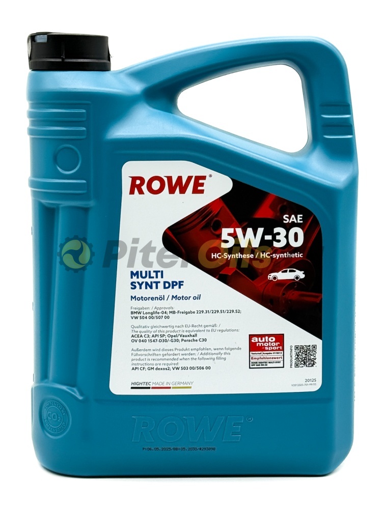 ROWE Моторное масло HIGHTEC MULTI SYNT DPF SAE 5W-30 (1л) 20125-0010-99 Рационализированное моторное масло премиум-класса на основе технологии HC-Synthese для бензиновых и дизельных двигателей легковых автомобилей с турбонаддувом и без турбонаддува, включая сажевые фильтры. Использование сырья высшего качества придают этому лидирующему продукту его высокую степень эффективности.
