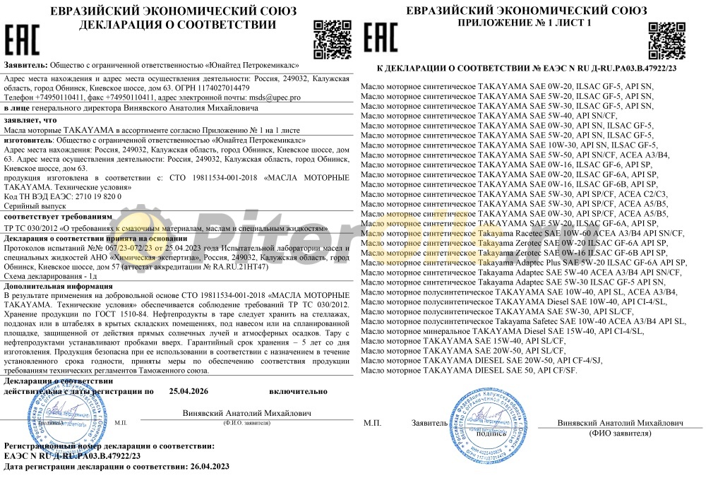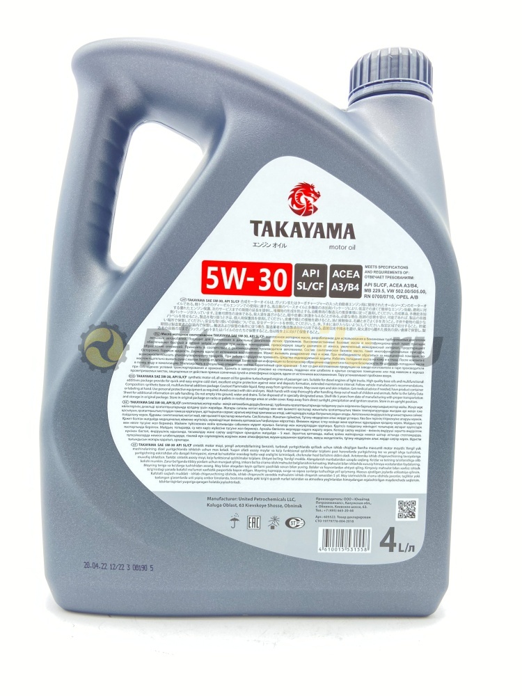 Синтетическое всесезонное моторное масло TAKAYAMA SAE 5W-30 API SL/CF разработано для использования в бензиновых, турбированных, двигателях легковых автомобилей. Подходит для применения в дизельных двигателях легких грузовиков. Высококачественные базовые масла и многофункциональный пакет присадок обеспечивает быстрый и легкий запуск двигателя при низких температурах, превосходную защиту двигателя от износа, увеличенный межсервисный интервал, предотвращает образование отложений. Обладает низким расходом на угар, отменными моющими свойствами, максимальным для данного класса ресурсом.