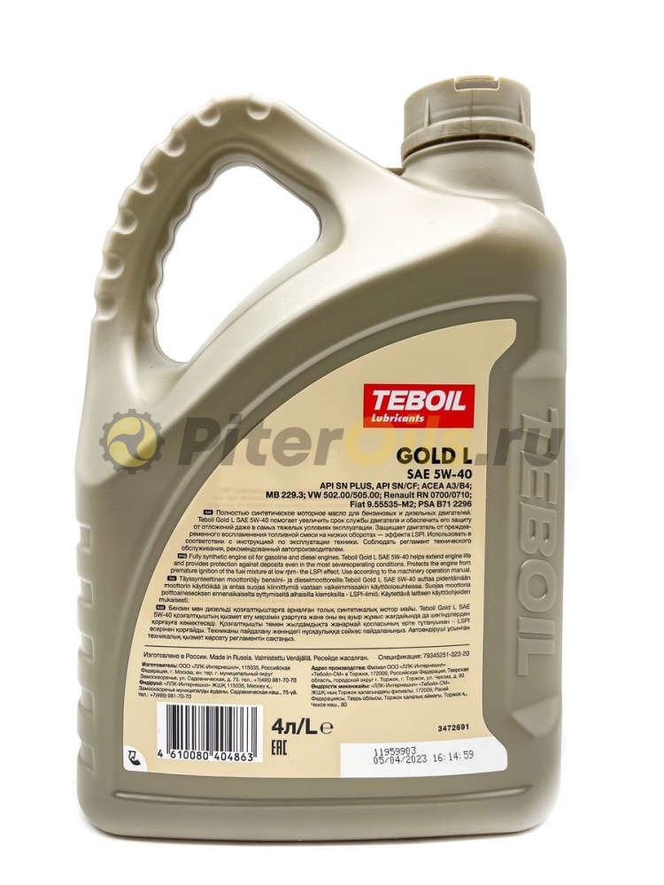 Комбинация полностью синтетического базового масла и усиленного пакета присадок адаптируется к разным режимам работы двигателя, усиливая противоизносные и моющие свойства моторного масла. Teboil Gold L 5W-40 защищает бензиновые двигатели современных автомобилей от преждевременного воспламенения топливной смеси на низких оборотах — эффекта LSPI.