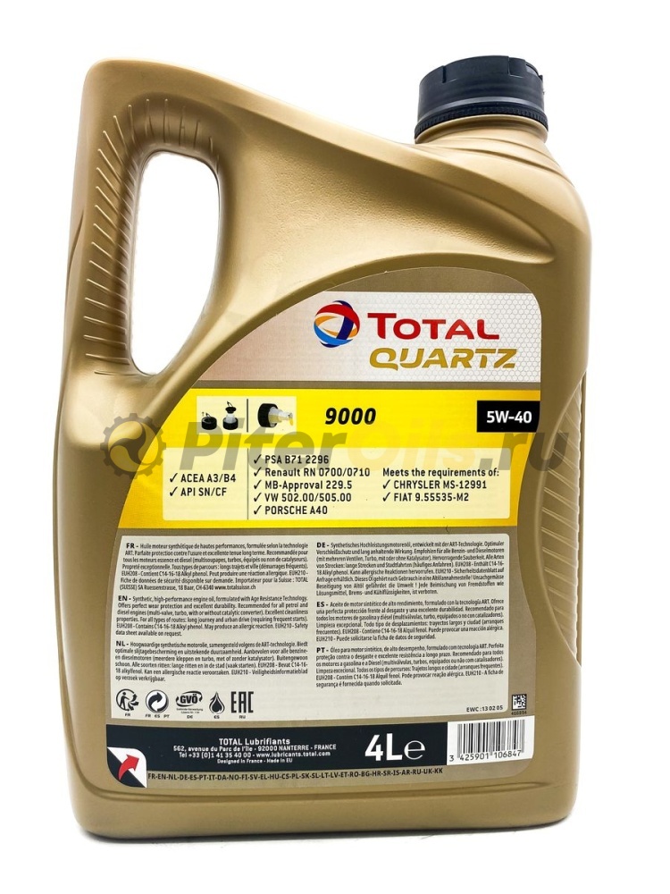 В каталоге автомагазина Piteroils, реализующего смазочные материалы, фильтры и автохимию, представлено масло Total Quartz 9000 5w40. Оно разработано и производится одноименным французским концерном по синтетическим технологиям.