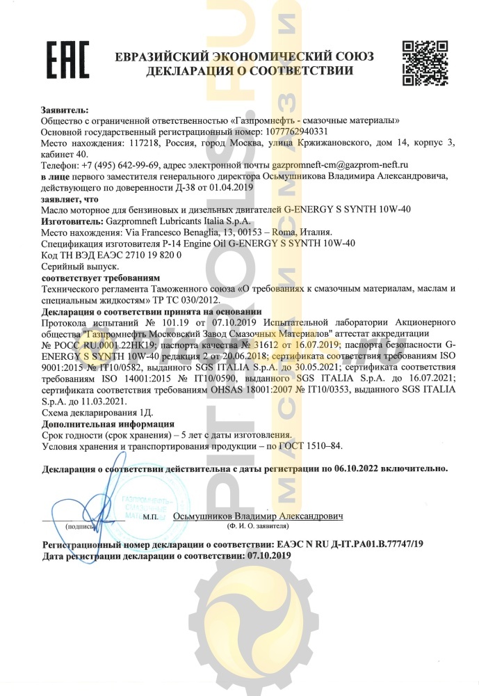 G-Energy S Synth 10w40 API SL/CF (1л)