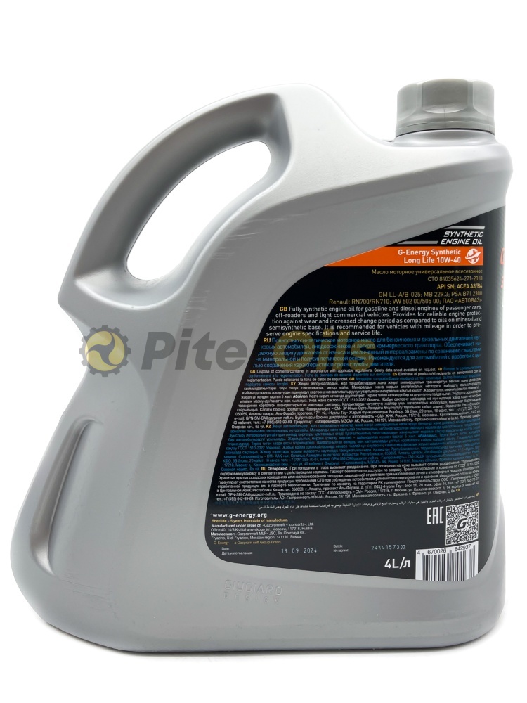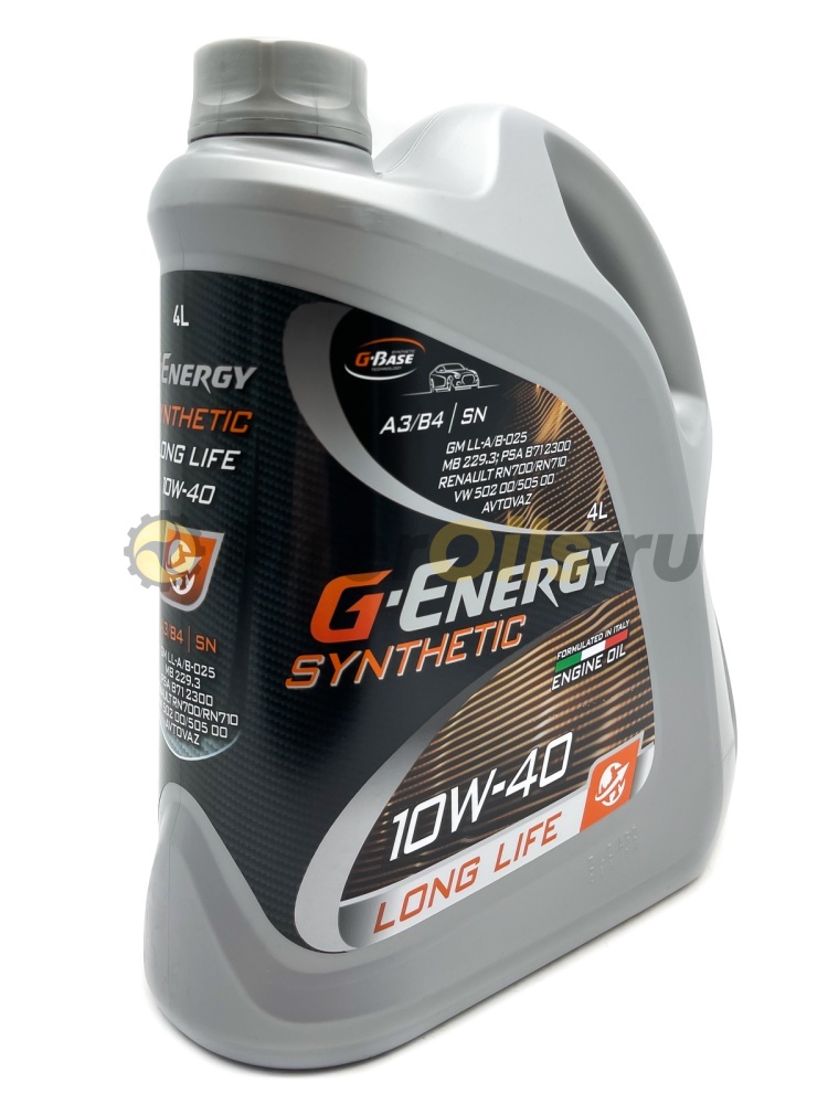 G-Energy Synthetic Long Life 10W-40 – синтетическое моторное масло на основе базовых компонентов G-Base для бензиновых и дизельных двигателей автомобилей. Благодаря надёжной защите деталей от износа и низкому расходу на угар позволяет увеличить интервалы между заменами масла и сохранить ресурс двигателя по сравнению с маслами на минеральной и полусинтетической основе. Поддерживает чистоту двигателя.