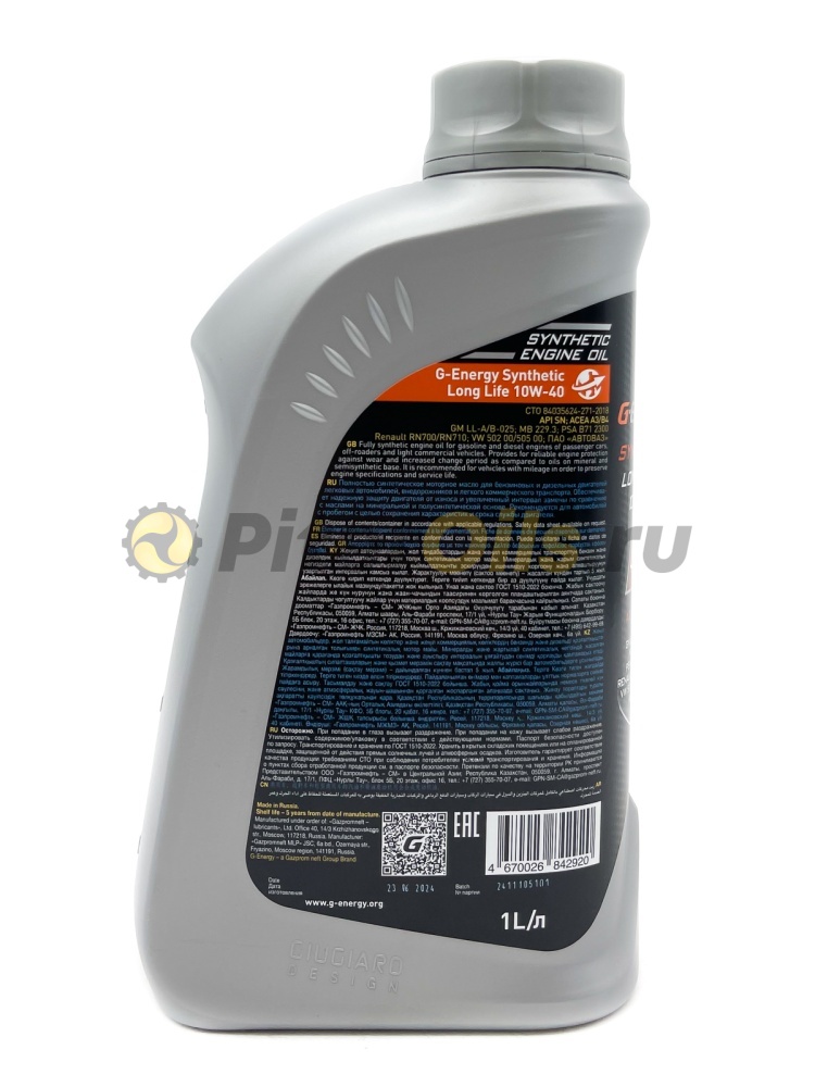 G-Energy Synthetic Long Life 10W-40 – синтетическое моторное масло на основе базовых компонентов G-Base для бензиновых и дизельных двигателей автомобилей. Благодаря надёжной защите деталей от износа и низкому расходу на угар позволяет увеличить интервалы между заменами масла и сохранить ресурс двигателя по сравнению с маслами на минеральной и полусинтетической основе. Поддерживает чистоту двигателя.