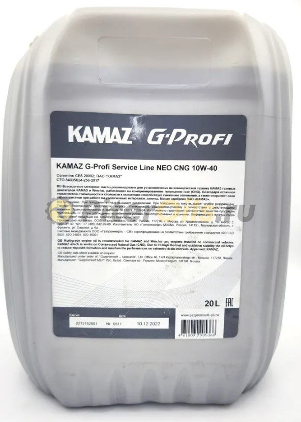 KAMAZ G-Profi Service Line NEO CNG 10W-40 – всесезонное синтетическое моторное масло, рекомендованное ПАО «КАМАЗ» для газовых двигателей КАМАЗ Р6 и Weichai. Большой запас нейтрализующих свойств в сочетании с полностью синтетической базовой основой позволяет обеспечивать работу на увеличенных интервалах замены в сравнении с обычными маслами для газовых двигателей.
