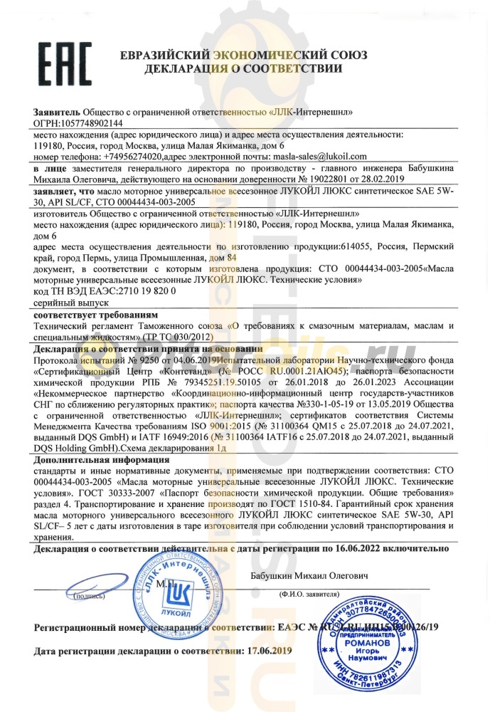 Лукойл Люкс 5W30 SL/CF синт (1л) 196272