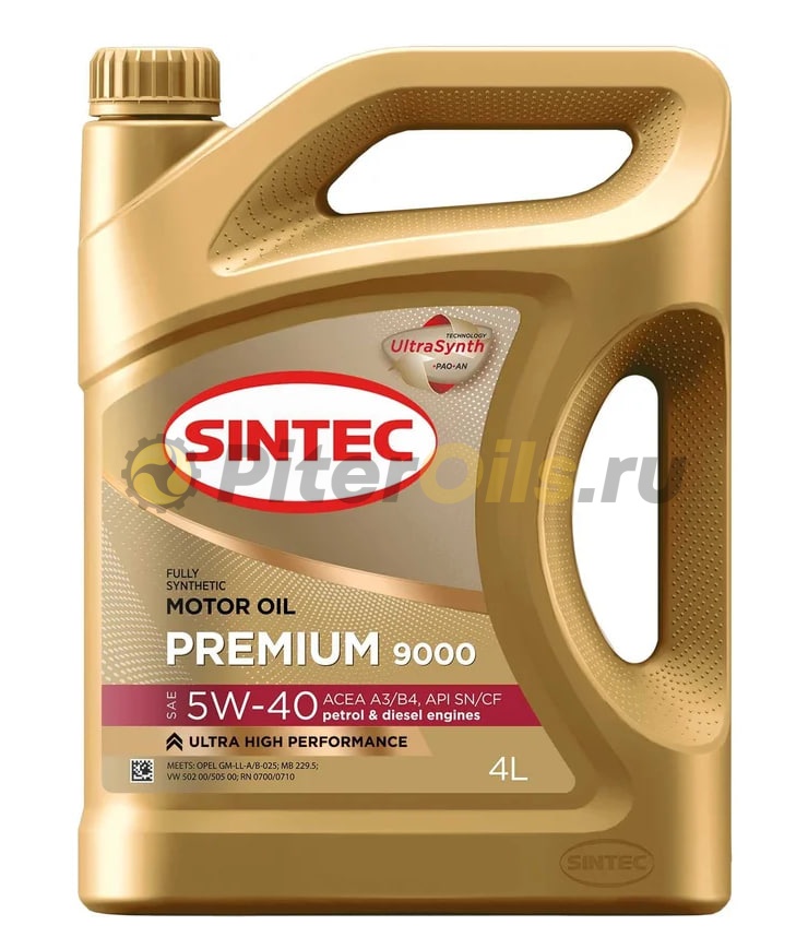 Полностью синтетическое моторное масло Sintec Premium 9000 5W-40 A3/B4 SN/CF производится по фирменной технологии UltraSynth с использование смеси синтетических базовых масел на основе гидрокрекинга (HC), полиальфаолефинов (PAO) и алкилированных нафталинов (AN), что обеспечивает готовому продукту низкую испаряемость, высокие индекс вязкости и термоокислительную стабильность, отличную текучесть при низких температурах. Идеально подходит для использования в ДВС с турбонаддувом и непосредственным впрыском топлива.