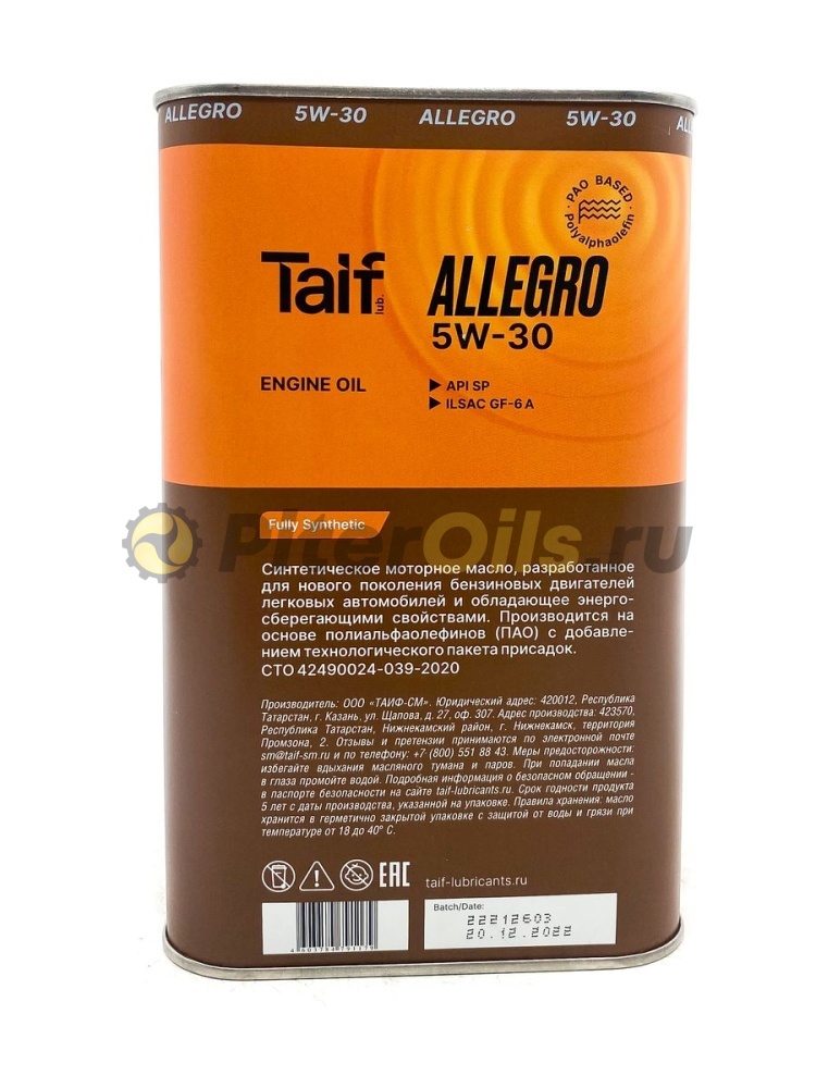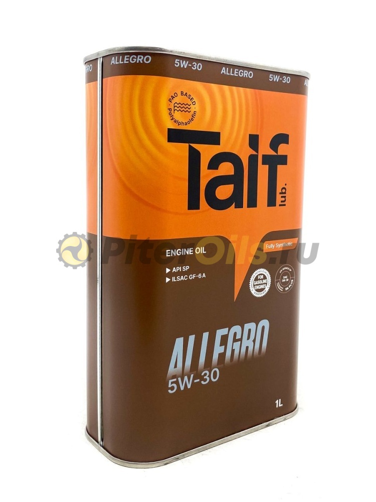 Моторное синтетическое масло Taif TAIF ALLEGRO, 5W-30, 1 л 211009 разработано для нового поколения бензиновых двигателей легковых автомобилей, обладает энергосберегающими свойствами. Производится на основе полиальфаолефинов (ПАО) и технологичного пакета присадок.