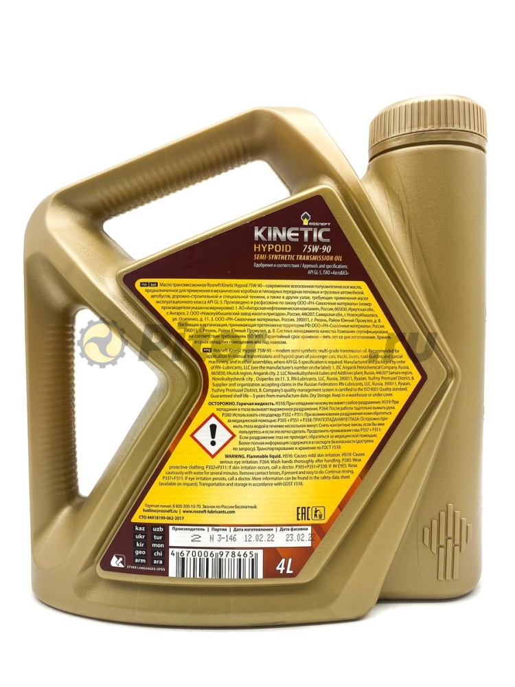 Rosneft Kinetic Hypoid 75W-90 - современное всесезонное трансмиссионное масло на полусинтетической основе, разработанное для применения в высоконагруженных ведущих мостах, гипоидных передачах и некоторых видах механических коробок переключения передач. Современный пакет присадок обеспечивает улучшенные противоизносные и противозадирные свойства в наиболее нагруженных зонах продольного скольжения между зубьями, увеличивая тем самым срок службы гипоидных передач.
